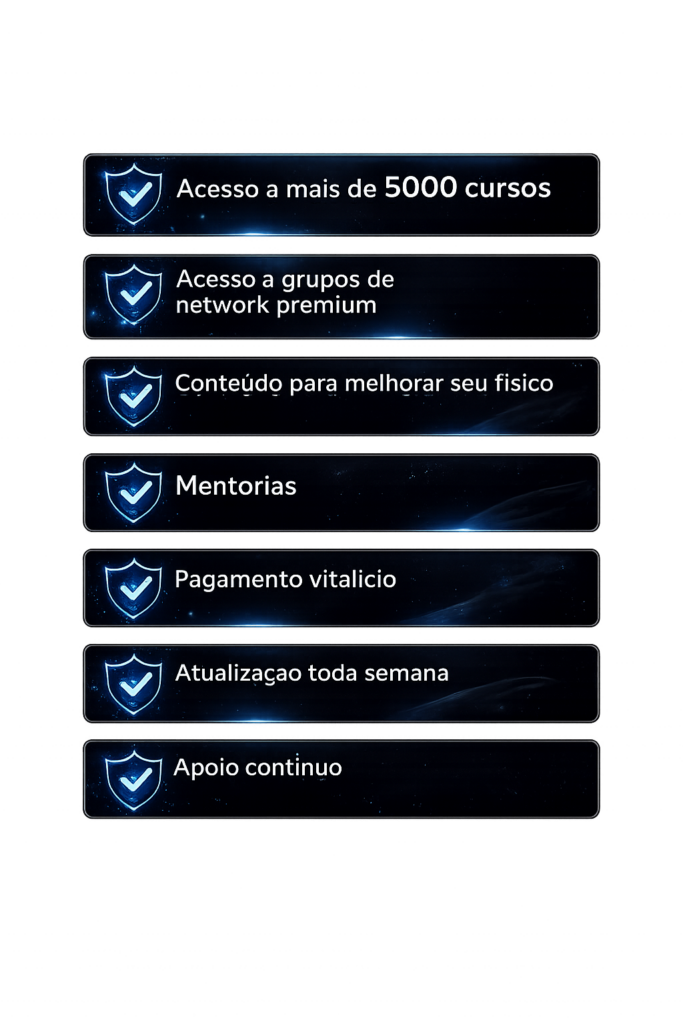 Tenha acesso a uma biblioteca com milhares de cursos organizados sobre marketing digital, renda online, automação e estratégias modernas para ganhar dinheiro na internet.
